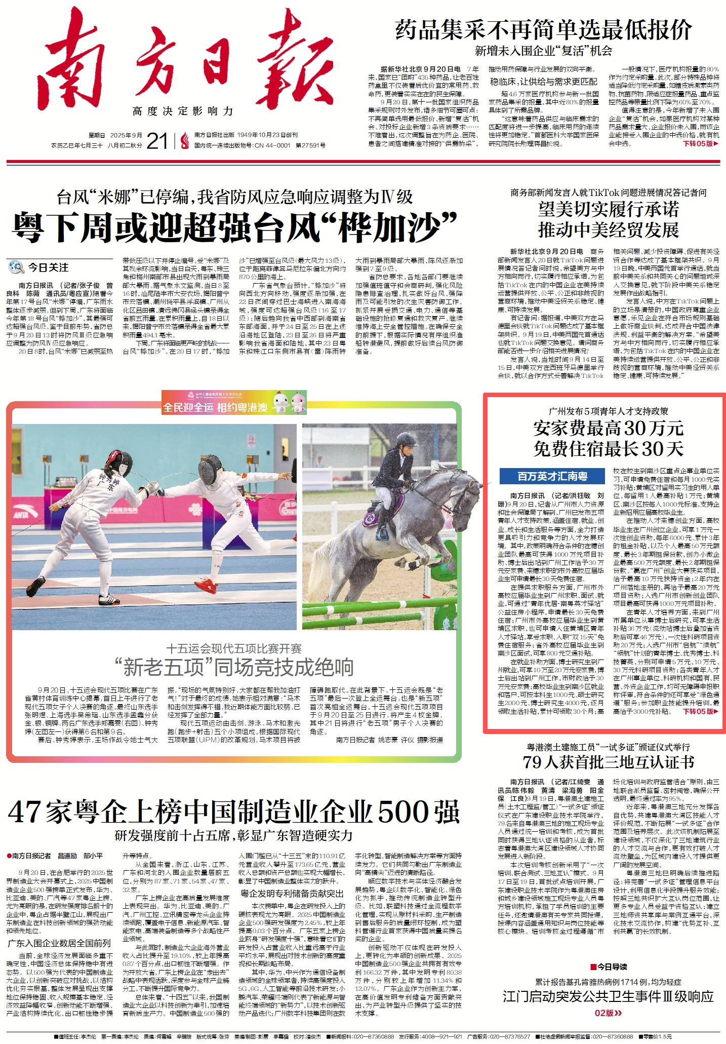 9月20日,记者从广州市人力资源和社会保障局了解到,广州已发布五项青年人才支持政策,涵盖住宿、就业、创业、成长和生活服务等方面,全力打造更具吸引力和竞争力的人才发展环境。其中,政策明确符合条件的在穗创业团队最高可获得1000万元项目补助、博士后出站到广州工作给予30万元安家费、来穗求职的市外高校应届毕业生可申请最长30天免费住宿。
